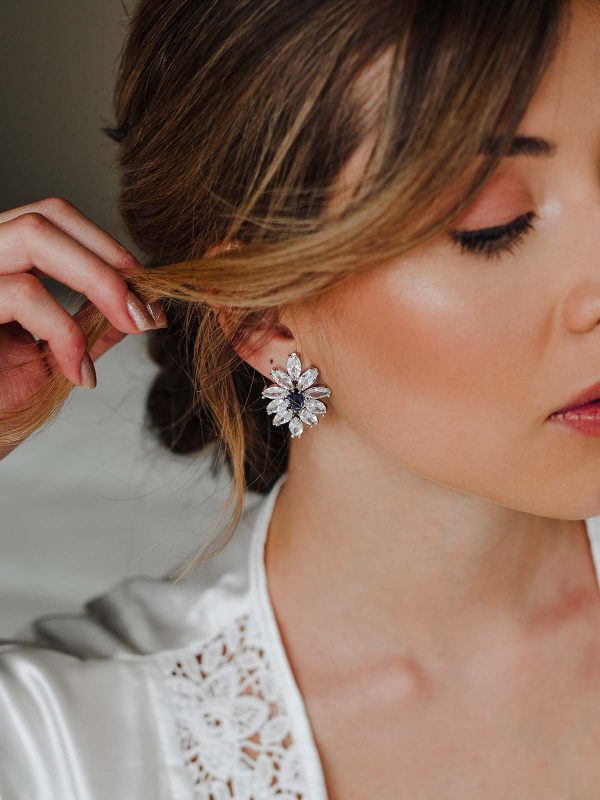 Los aretes Sara tienen circones que añaden un brillo sutil y una piedra azul delicadamente seleccionada para simbolizar el amor y la serenidad en tu nuevo capítulo. El tamaño medio de los aretes los convierte en el equilibrio perfecto entre lo llamativo y lo delicado, complementando a la perfección tu vestido de novia.