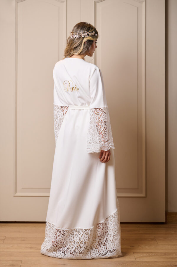 Nuestra hermosa Bata Cuarzo elaborada en un Via Spiga suave e imponente con una caída llena de elegancia, acompañada de guipiur en mangas y en ruedo haciendo de ella la bata ideal para el Shooting!
