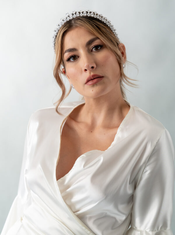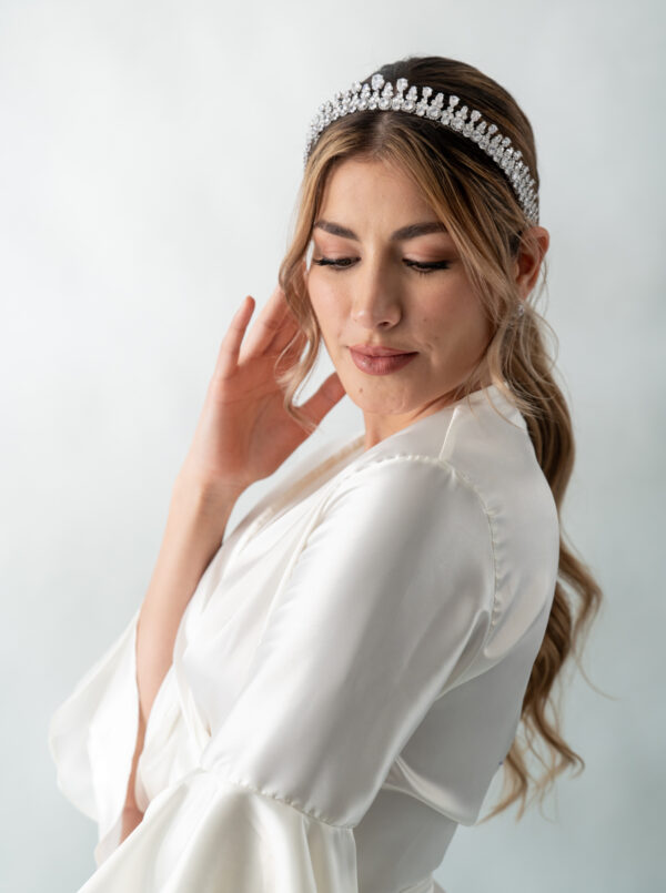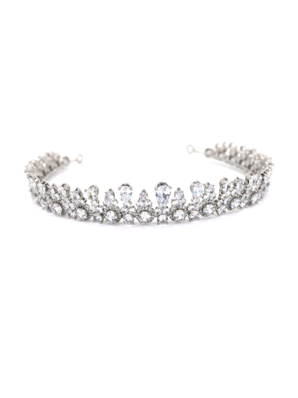 Nuestra tiara Lisa presenta un diseño detallado clásico, está adornada con cristales de circón que capturan la luz de manera sublime brindando un brillo inigualable. El complemento ideal para lucir un peinado elegante y sofisticado.