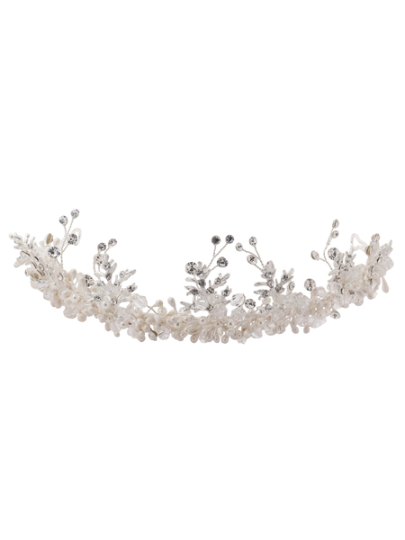 Una increible tiara tejida a mano, llena de brillo, perlas y cristales, luce radiante en el gran dia con esta tiara de ensueño.  No incluye aretes